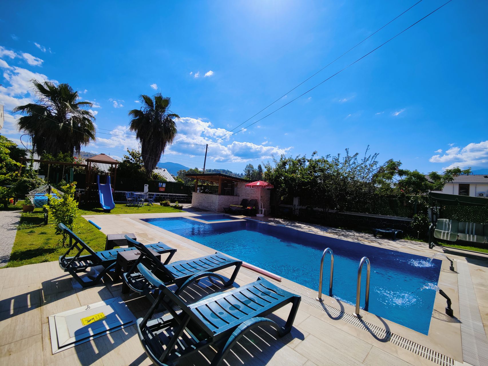 Güneşlenme Alanları: Havuzun etrafındaki geniş güneşlenme alanları, güneşin tadını çıkarmanız ve bronzlaşmanız için mükemmel bir fırsat sunar. Rahat şezlonglar ve gölgelik alanlar, rahatınızı düşündüğümüzün bir göstergesidir.